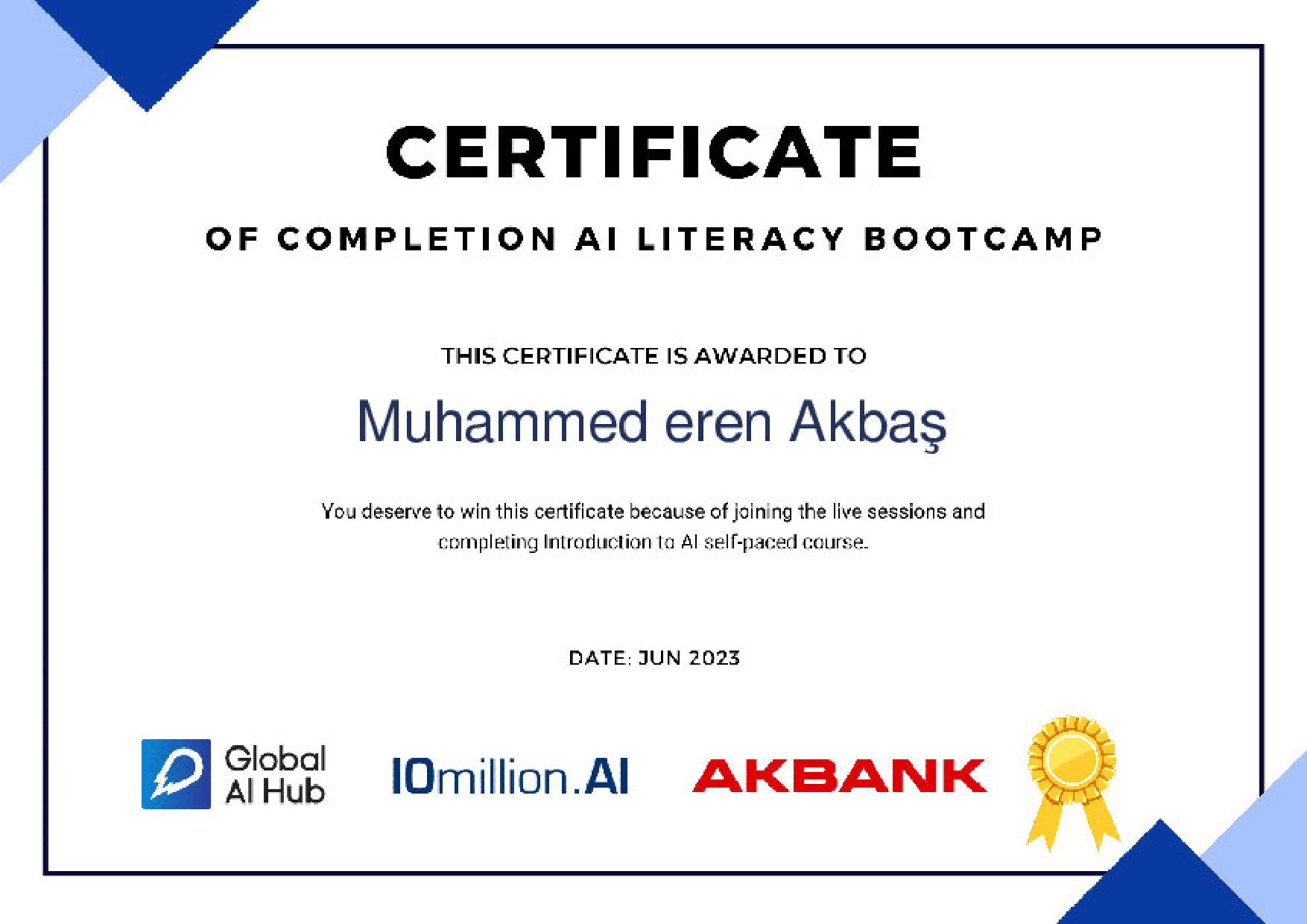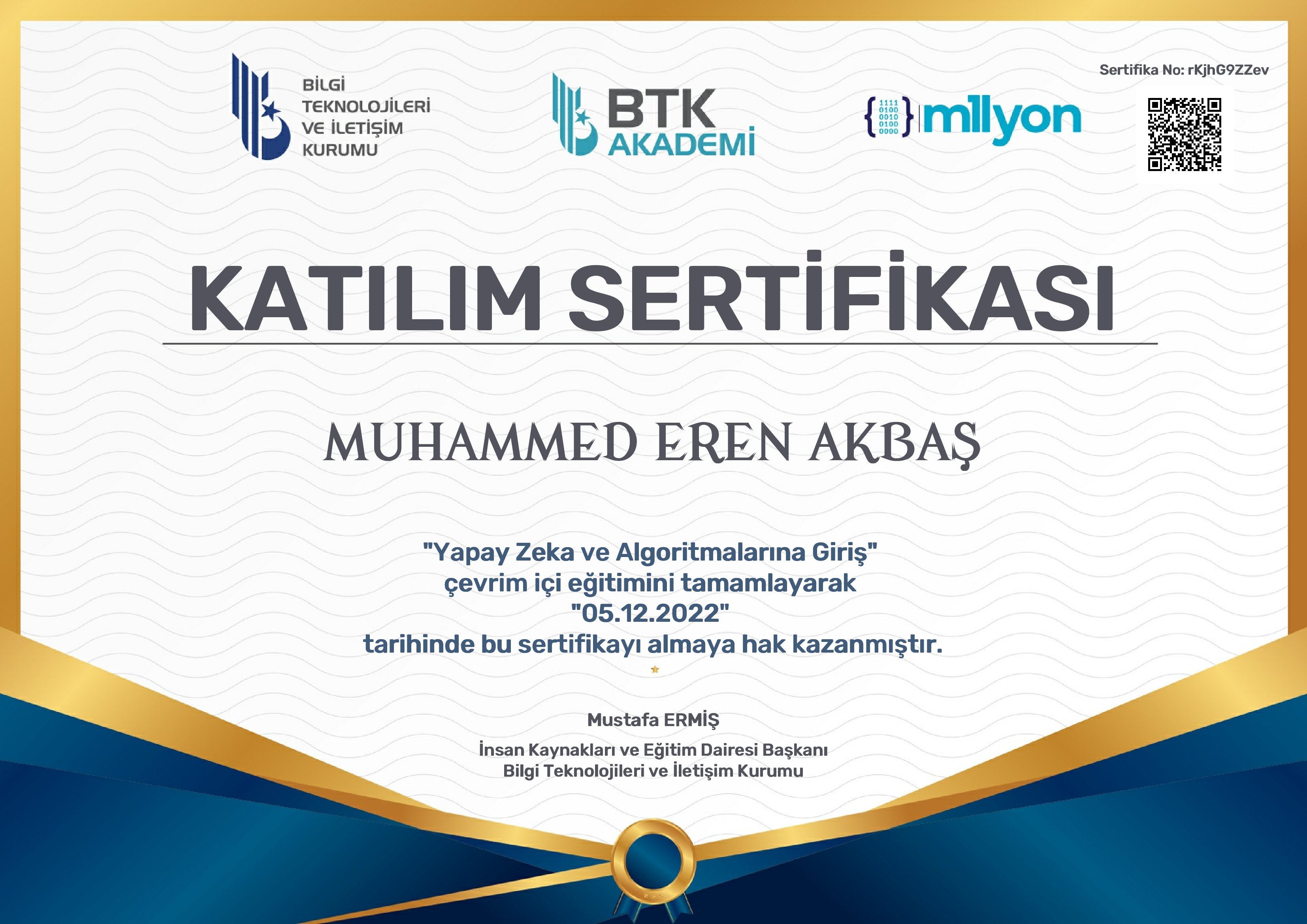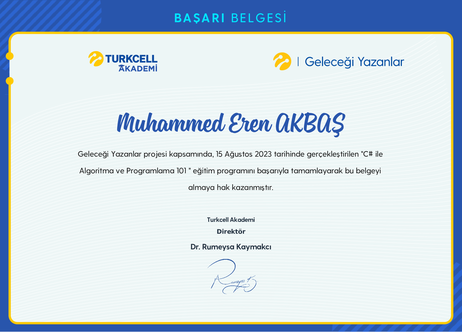 Merhaba! Ben Muhammed Eren, sürekli öğrenmeye açık bir yazılım geliştiricisiyim. Dumlupınar Üniversitesi'nde okurken C# kursu alarak kendimi geliştirmeye başladım. İlk otomasyon projemi tasarlamaya başladım. Şuan 42 İstanbul'da C ve C++ dillerinde eğitim alarak kendimi geliştirmeye devam ediyorum.